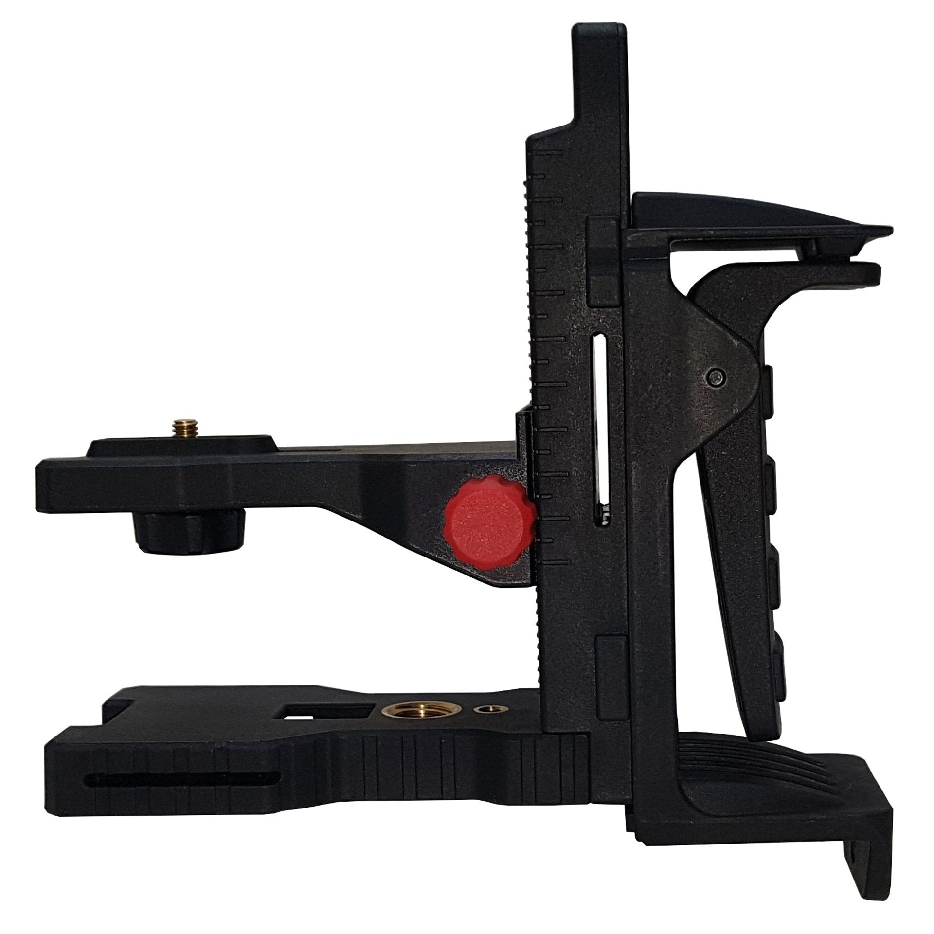 Der zweiteilige Wandhalter eignet sich zur Befestigung von Punkt- oder Linienlasern an Wänden, Winkelschienen oder Stativen (5/8", 1/4"). Er besteht aus einem vertikal verstellbaren Instrumententräger mit 1/4"-Anschluss und einem Grundträger mit Klammer. Die Vertikale ist bis zu 14 cm verstellbar. Der Instrumententräger und der Grundträger sind magnetisch verbunden.
