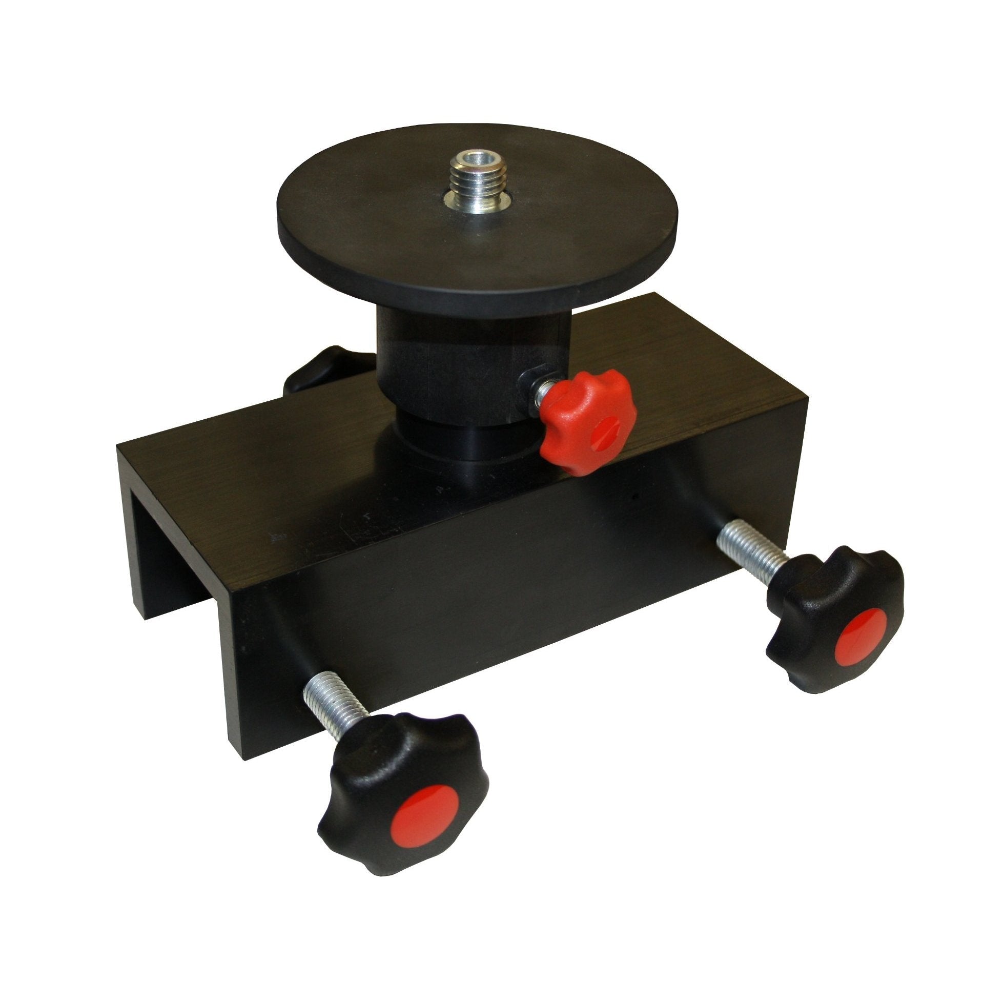 Mit dem Bohlenhalter positionieren Sie einen Theodoliten oder Rotationslaser bequem auf einem Schnurgerüst. Der Bohlenhalter wird dabei durch die Führungsschienen über die Achsenmarkierung auf einer Schnurgerüstbohle positioniert und mit den Anzugsschrauben fixiert.